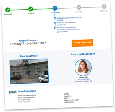 Je hebt samen met de adviseur je keuze gemaakt en het adviesrapport ontvangen. Nu gaan wij aan de slag om je hypotheek definitief te regelen. Je ontvangt een persoonlijk renteaanbod en in je eigen online omgeving zie je wat je nog moet aanleveren om jouw dossier compleet te maken! Kom je er even niet uit? Jouw persoonlijke hypotheekcoach helpt je graag rechtstreeks via WhatsApp. Via ons slimme Track & Trace-systeem zie je precies in welke fase je zit en wat wij van je verwachten.